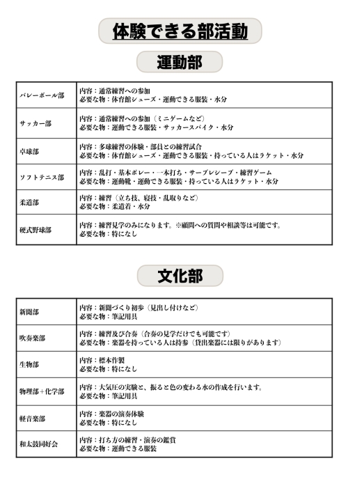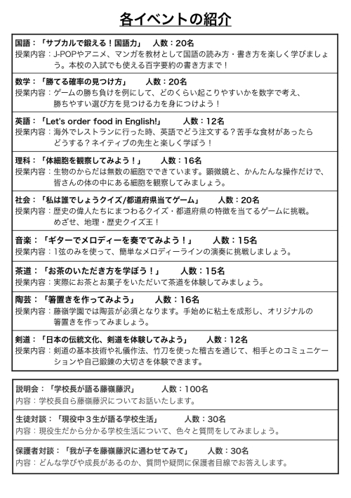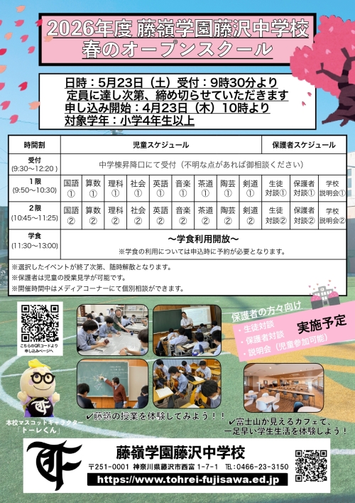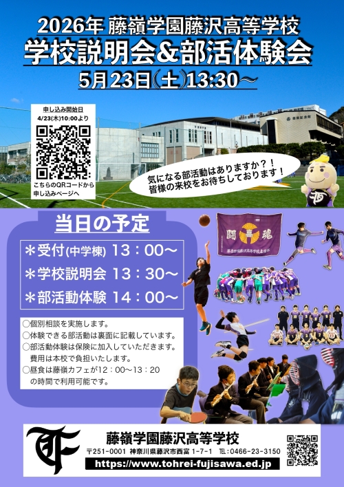 2026/04/23 受験生・保護者の方 Tweet 5月23日(土)に、中学ではオープンスクール、高校では部活動体験会が開催されます。オープンスクールでは、5教科の授業のほか、本校の特色である茶道・剣道・陶芸を体験することができます。また、高校の部活動体験会では、部活動体験に先立ち学校説明会も実施されます。いずれのイベントも、藤嶺藤沢を知る貴重な機会です。多くの受験生・保護者の皆様のご来場をお待ちしております。お申し込みは本日から可能です。イベントの詳細については、以下の写真やホームページなどをご確認ください。 Tweet