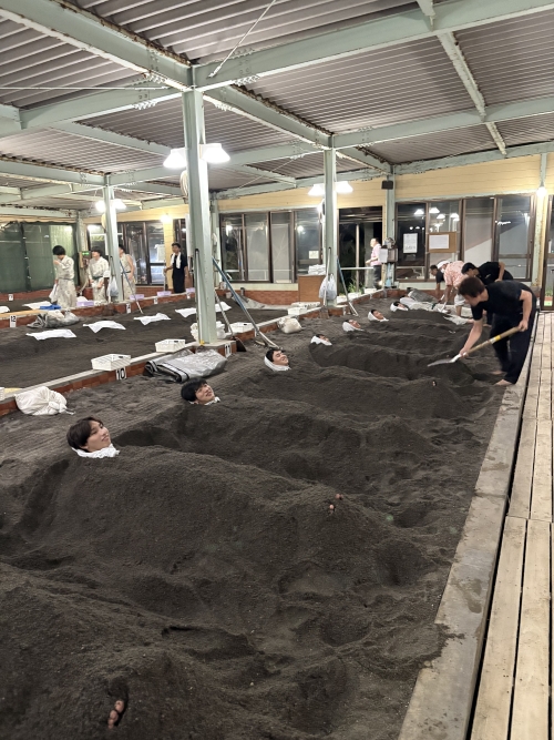一日の締めくくりには、指宿名物の砂蒸し風呂を体験。最初は照れながらも、温かな砂に包まれると自然と笑顔がこぼれ、旅の疲れを癒しながら仲間との語らいも弾み、心身ともにリフレッシュできるひとときとなりました。「また入りたい!」という声も上がるほど、非日常の体験を楽しむことができました。