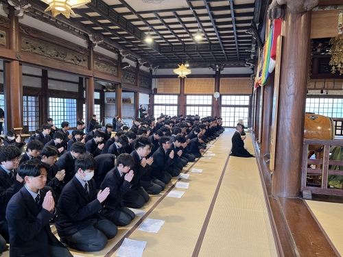 2月15日は、仏教の世界においてお釈迦様がお亡くなりになった日とされ、「涅槃会(ねはんえ)」として大切にされています。本校ではこの日にあわせ、2月13日(金)の学林の時間に、遊行寺本堂にて法要を行いました。