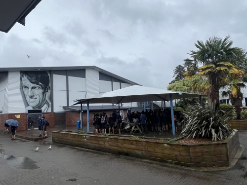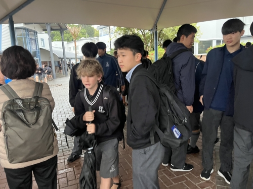 今日はニュージーランドに来て初めての雨の一日でした。タウランガボーイズカレッジ(TBC)では、授業以外の時間に教室に入らないルールになっており、多くの生徒が屋根の下で雨宿りをしてから授業に向かいます。また、今日は校内でジャズバンドに所属する生徒がコンサートを行っており、去年9月に藤嶺に来校して交流した学生とも再会しました。この1週間で、昨年本校で受け入れたTBCの学生が藤嶺生に声を掛けに来る場面もありました。ぜひ生徒には、今回のバディとの交流、ファミリーとの縁をこれからも繋いでいってほしいと願います。