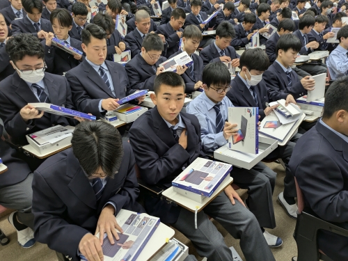 一貫生は中学で配られたタブレットが新しくなり、また高入生は初めてのタブレットでしたが、登録作業にて手こずるなど初々しい様子も見られました。