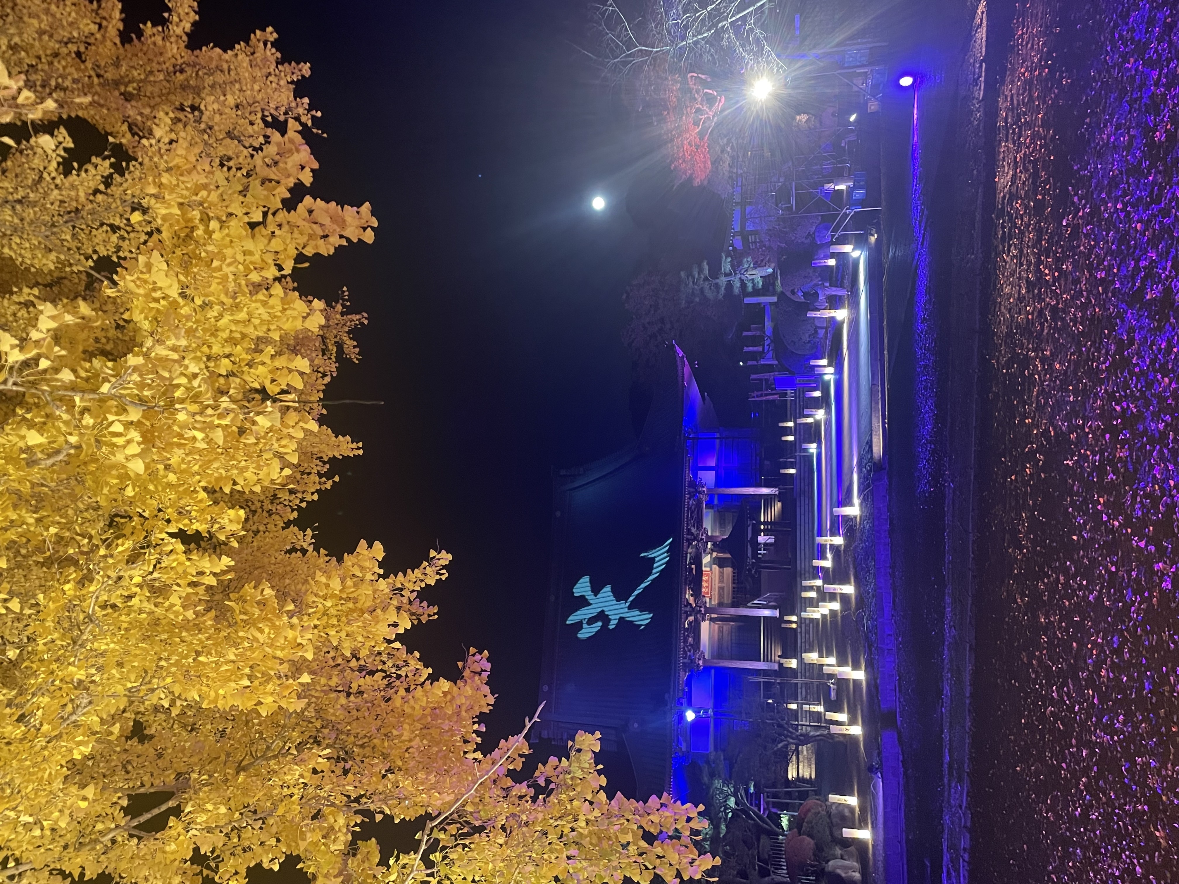 今年の開催期間は 12月6日から12月14日まで。昨年よりもさらにスケールアップし、見どころが増えています。特に注目すべきは、本堂の屋根に浮かび上がる大きな「光」の文字。その堂々とした筆致は、灯篭に書かれた「遊行の光」とともに、お上人様(理事長先生)自らが揮毫されたものです。