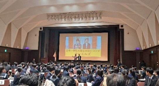 午前は、全国各地のいじめ防止の取組についてのポスター発表が行われ(写真④)、午後は、全国の学校を数多く訪問しているお笑いコンビオシエルズ(矢島ノブ雄氏・野村真之介氏)による講演がありました。いじめ被害体験についてのお話を伺ったり、「数学の授業」などのコントを通して学んだりしました。(写真⑤)