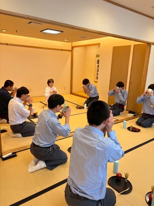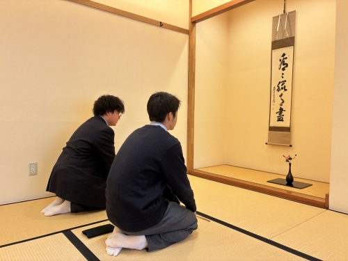 高入生茶道授業は2年間行われます。 1年生では、床間を拝見することを通して和室での作法を学び、床間を設えた亭主を敬う心を育てていきます。掛軸が変わると生徒たちは興味深く書かれた禅語の読み方や意味を聞いてきます。お菓子をいただき、お茶を点てることで茶道に親しんでいきます。お盆とポットを使った略盆点の点前で細かい所作を学びます。 2年生では、薄茶平点前を学びます。3学期に保護者をお招きして行う修了茶会に向けて、お客様に心地良いひとときを過ごしていただくためにはどうすれば良いか【おもてなし】について考えます。和敬清寂の精神を大切に日本文化を学びます。