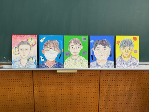 中学1年生の課題は「人物の点描画」です。描く練習として濃さの違う鉛筆を使い石膏の球体をデッサンしました。光や影の向き、立体感がどうしたらでるのかよく観察し仕上げていきました。本番ではモデルの友達を観察しながらデッサンし、アクリル絵具を点描し色をつけていきます。肌の色以外は単色で点描し、画面上で混色したように見せるという視覚効果を利用しています。この色に見えないな〜と悩みながらも何度も点をうち作品を仕上げていきました。
