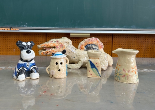 中学2年生は「花器か鉛筆立て」を焼物で制作しました。用途を考えながら自身でアイディアを出し、1人1人形に合った技法で形を作りあげました。1年生の時に行ったお茶碗作りからレベルアップした作品が出来上がりました。