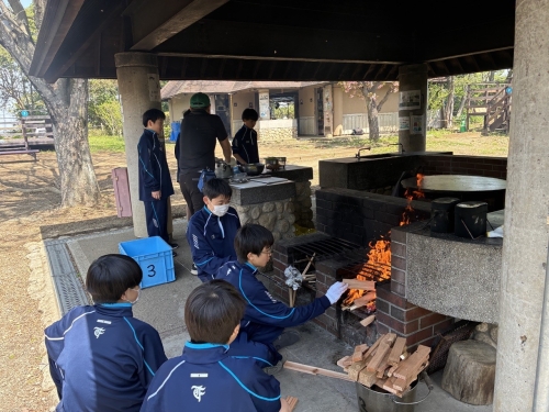 校長先生の講話の後は、昼食のカレー作りをしました。焚き火での調理は少し難しいようでしたが、力を合わせて美味しいカレーを作ることができました。