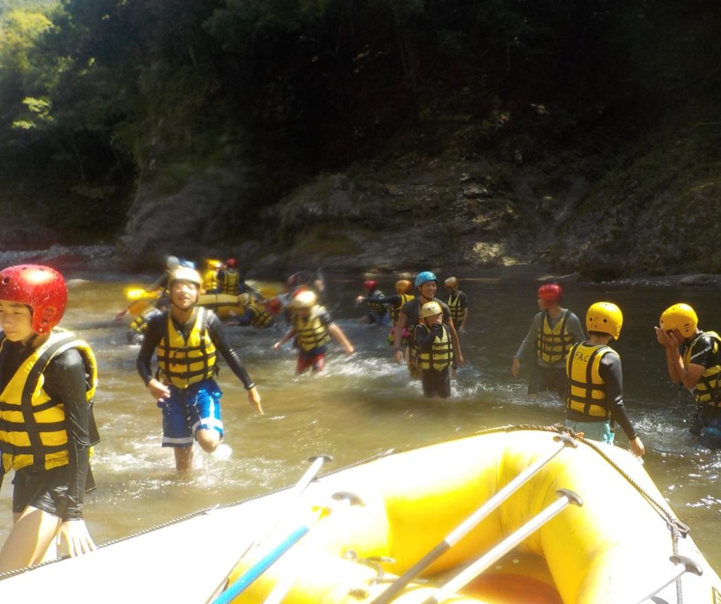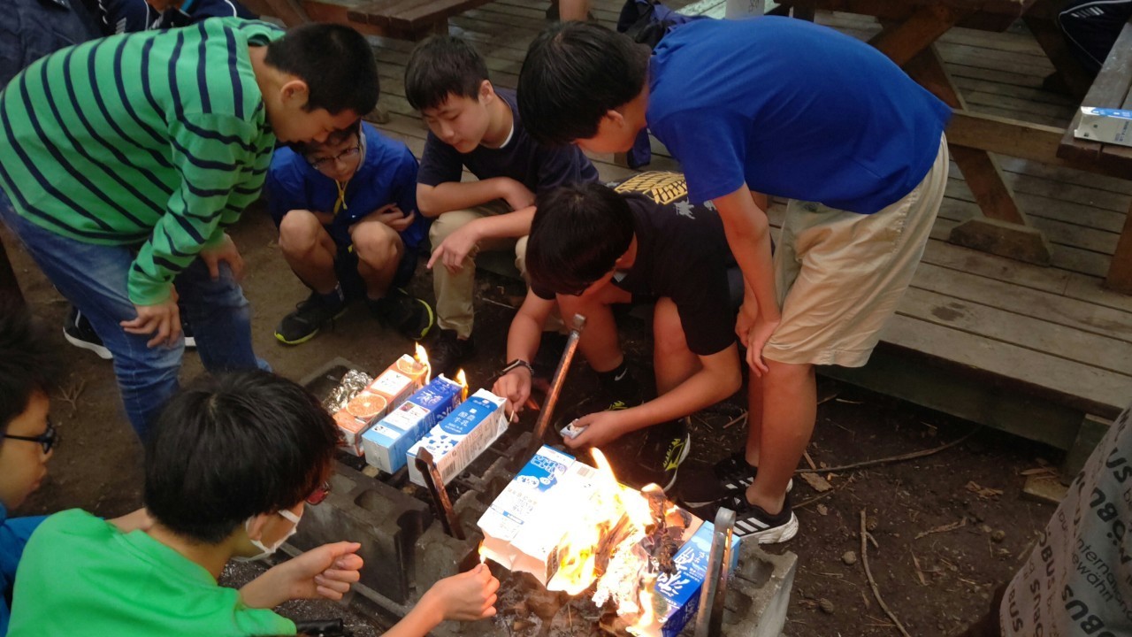 今日は選択プログラムであるカヌーとラフティングです。カヌー・ソーセージ作り組とラフティング組で分かれてそれぞれ移動しました。この日は曇りと雨予報でしたが、天気に恵まれ晴れてくれました。その後、それぞれの場所でお土産を買い、森と湖の楽園に帰り、夕食を作り、キャンプファイヤーでクイズ大会をやりました。